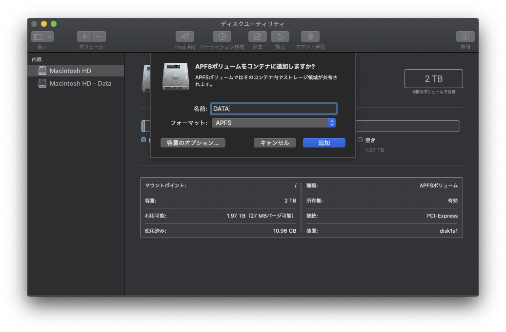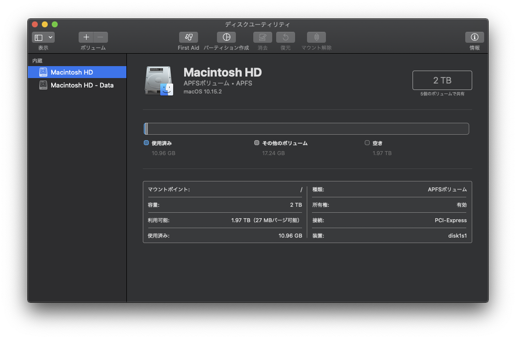 先ほどからディスクユーリティappのスクリーンショットで表示されている「Macintosh HD」と「Macintosh HD - Data」があります。