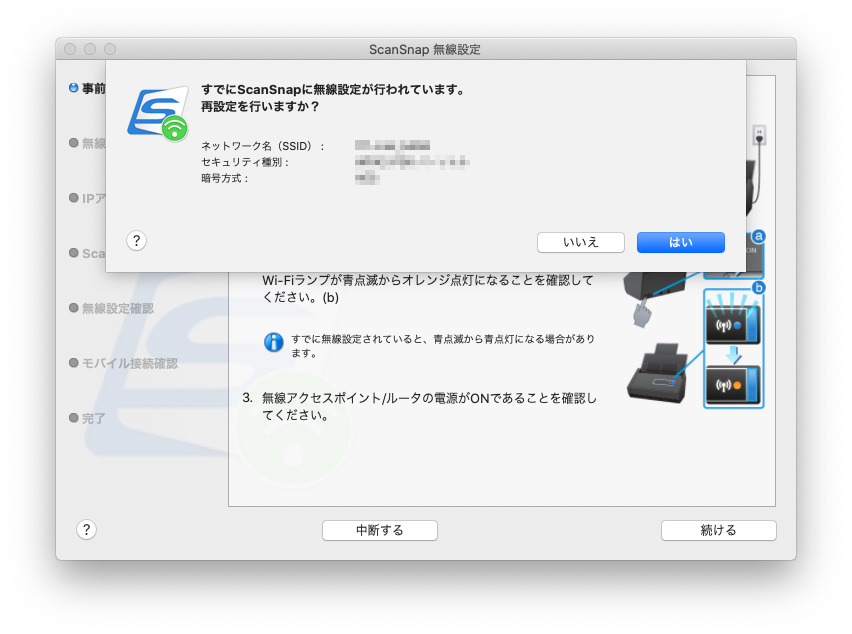 ScanSnapHomeのメニューバーから環境設定>スキャナー、内の「無線設定」をクリックで出来ます。