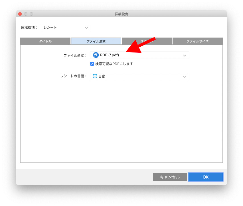 PDFに変更して「検索可能なPDFにします」にチェック入れます
