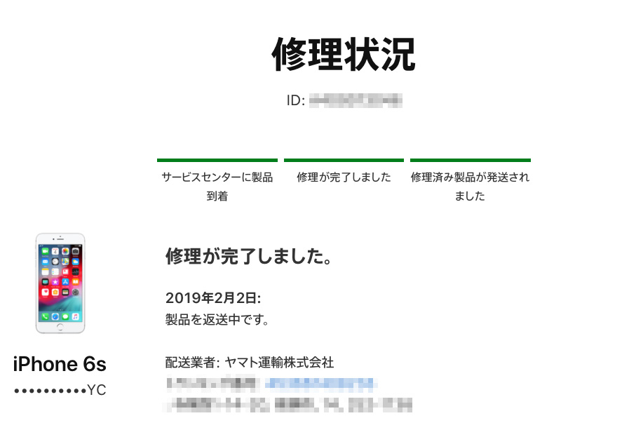 その後、修理状況のステータス。2月14日でもまだ「修理済み製品が発送されました」のまま(滝汗