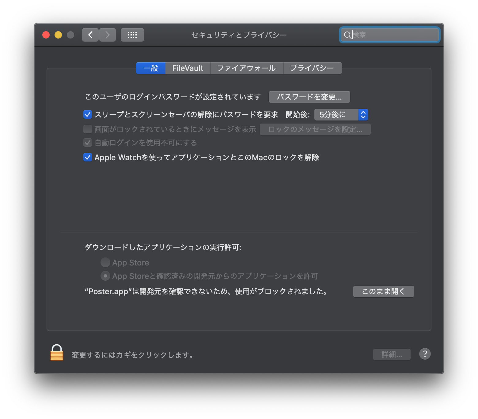 「”Poster.app"は開発元を確認出来ない為、使用がブロックされました。」とシステム環境設定のセキュリティとプライバシーの画面で表示されました。