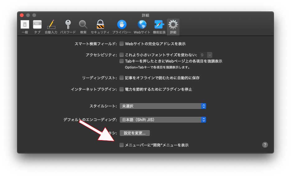 「Safari」>「環境設定」>「詳細」